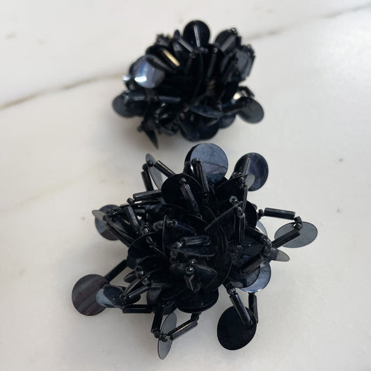 Vintage Black Beaded Clip Earrings 1980s