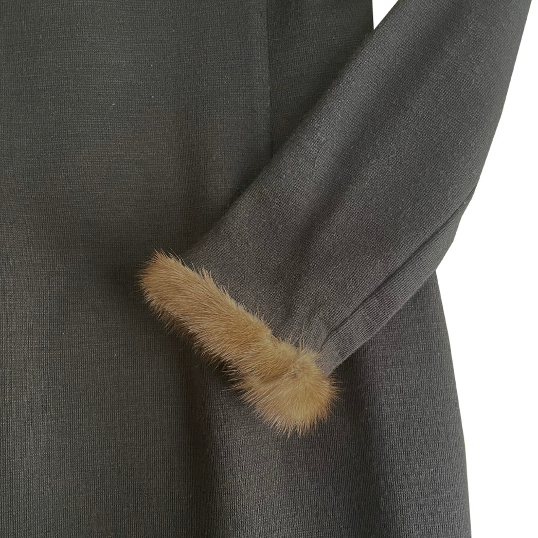 Questo abito corto vintage degli anni '80 è realizzato in jersey nero di alta qualità, con spalle imbottite caratterizzato da dettagli raffinati in vera pelliccia sul collo e sui polsi. Il design sobrio e lussuoso conferisce un'eleganza senza tempo, ideale per occasioni speciali o serate eleganti, combinando comfort e stile classico con un tocco distintivo di prestigio.