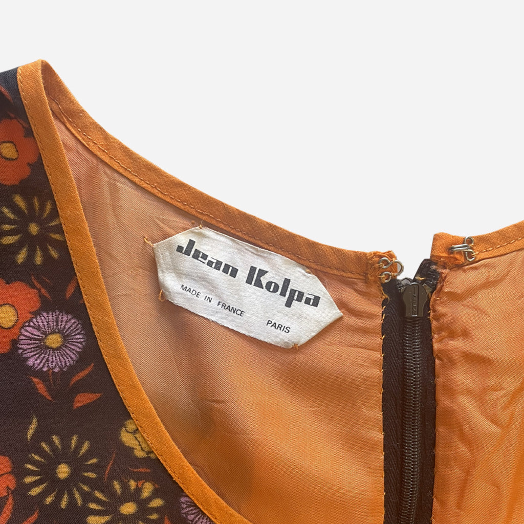 Vestito lungo vintage degli anni '70. La fantasia floreale marrone lo rende elegante e sofisticato, mentre la lunghezza lo rende perfetto per un look senza tempo
