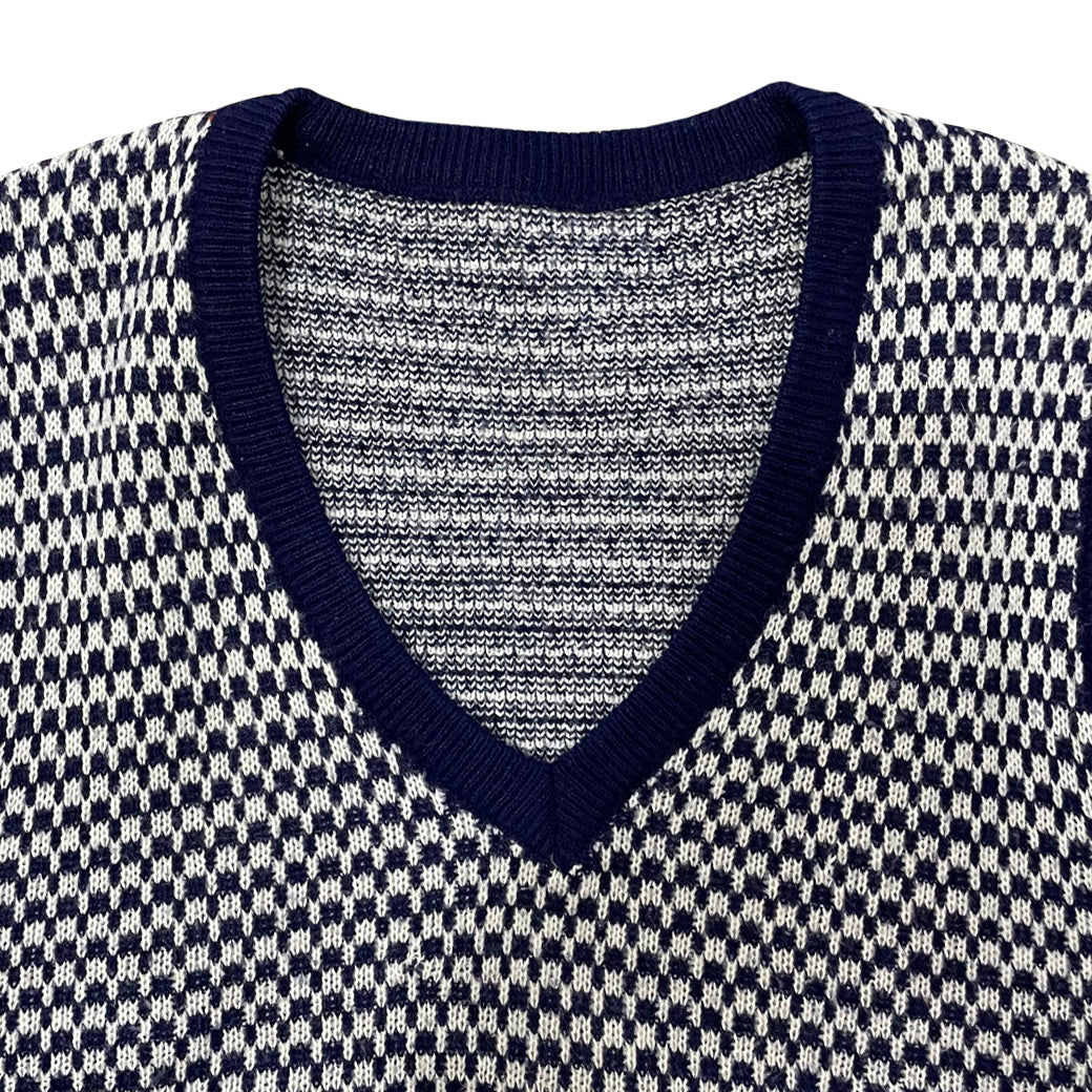 Questo gilet vintage anni ’70 bicolore, bianco e blu, si distingue per il suo scollo a V corto, che valorizza qualsiasi outfit. Ideale da abbinare a pantaloni a vita alta, offre un tocco autentico e sofisticato tipico dell’epoca, perfetto per chi cerca uno stile retrò curato e originale.