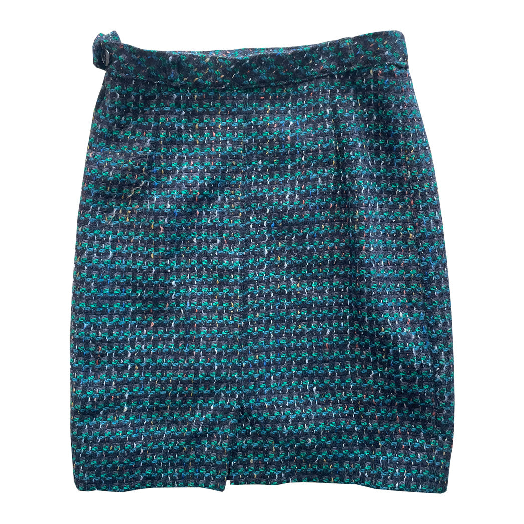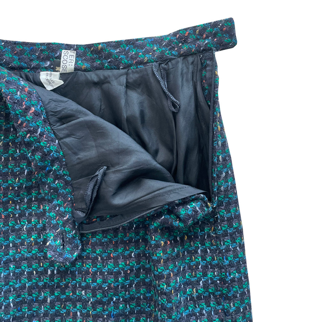 Tailleur in lana autentico degli anni Ottanta, caratterizzato da una giacca strutturata con revers in velluto e spalle marcate che definiscono una silhouette decisa e sofisticata. La gonna abbinata completa l'insieme con proporzioni tipiche dell'epoca. Realizzato in lana di qualità, questo pezzo vintage incarna l'eleganza power dressing del decennio, perfetto per chi ricerca autenticità e carattere nel proprio guardaroba.