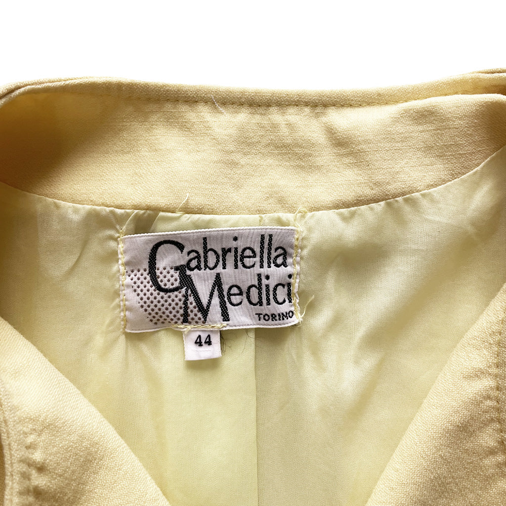 Questa giacca vintage degli anni ’80, firmata Gabriella Medici e prodotta in Italia, si distingue per il suo raffinato colore giallo pastello e le maniche a sbuffo, tipiche dell’epoca. La chiusura a cinque bottoni e il taglio corto sotto la vita la rendono perfetta da abbinare a pantaloni a vita alta, valorizzando la silhouette con eleganza e carattere. Un capo iconico per chi ricerca autenticità e stile senza tempo.